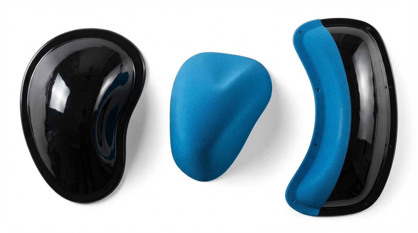 Dual texture holds have a combination of textured and smooth surfaces. The texture is where you want to direct your grip, while the rest of the surface is more slippery. This allows route setters to precisely control the difficulty and movement. Ideal for modern bouldering problems and competition setups.